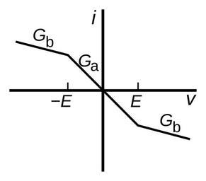 | Keywords: Chua diode characteristic curve.svg characteristic curve of Chua's diode or nonlinear resistor a nonlinear electronic component used in Chua's circuit a simple electronic circuit that displays chaotic behavior Chua's circuit invented by Leon Chua in 1983 is one of the simplest chaotic systems and is widely used as a reference example of chaos The function is piecewise-linear made of three straight line segments The inner segment has a slope conductance of G<sub>a</sub> The outer segments which begin at the voltage breakpoint ±E have a shallower slope of G<sub>b</sub> The line is in the 2nd and 4th quadrants of the IV plane which represents a negative resistance and so requires active energy producing elements like amplifiers in it Typical circuits used to realize it consist of an op amp circuit called a negative impedance converter NIC in parallel with a resistor-diode network 2014-02-07 21 15 41 own Chetvorno cc-zero Uploaded with UploadWizard Negative resistance Chaos oscillators Device current-voltage characteristics |