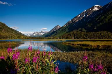 Keywords: chugach national forest alaska landscape scenic snowcap sky clouds wilderness nature outdoors forest trees woods valley beautiful travel vacation holiday picturesque lake water reflections flowers plants fireweed