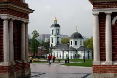 Keywords: church building cathedral white dome bell tower red brick walls white pillars sky