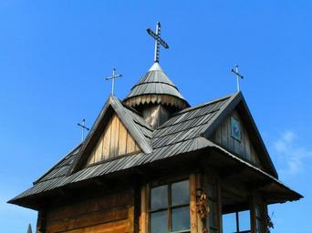 Keywords: church building cross crucifix architecture wooden sky blue