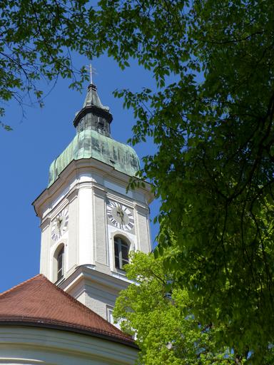 Keywords: church building neustift freising monastery church tower clock tower green blue white trees architecture sacral sky roof spire bavaria upper bavaria