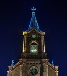Keywords: church building sky tower blue finnish religion evening lights cruciform church lutheran architecture