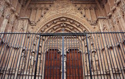 Keywords: church cathedral entrance gate fence historic catholic gothic historical landmark building famous old culture sightseeing religion cross architecture railing wood doors arches