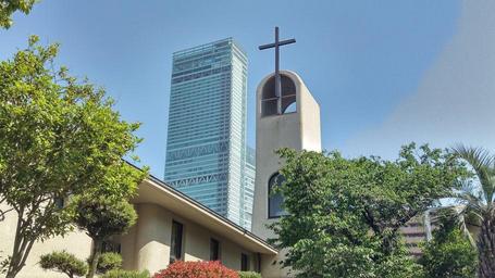 Keywords: church catholic religion christianity the cross blue sky bill building