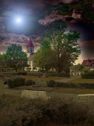 Keywords: church cemetery churchyard trees graves grave homes clouds sky