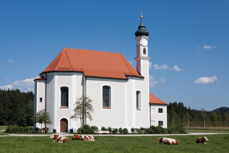 Keywords: church chapel building christian small church bavaria upper bavaria gem baroque rococo christianity religion architecture onion dome pasture sky blue white faith clouds