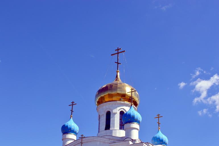 Keywords: church christianity cross sky blue clouds summer religion dome gold