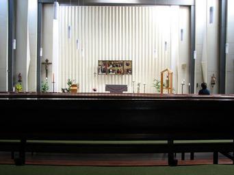 Keywords: church church room interior triptych tabernacle altar nave pray person religion faith catholic church pews roman catholic christian christianity holy awe rest silent benefit from
