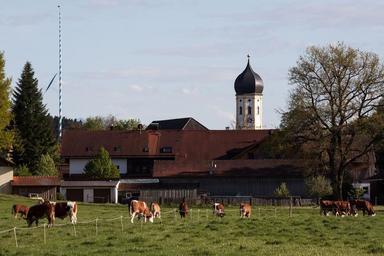 Keywords: church onion dome baroque upper bavaria rural village pasture cows young cattle cattle maypole spring tradition blue white green
