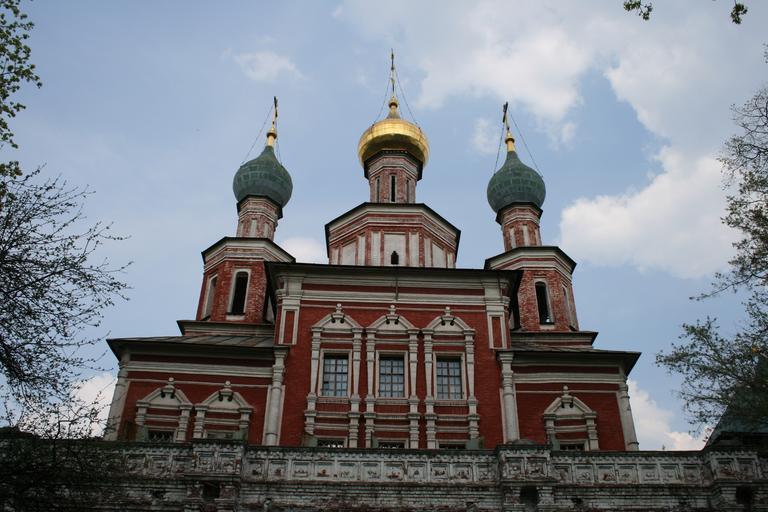 Keywords: church religious building architecture roof towers domes green white and red convent windows sky