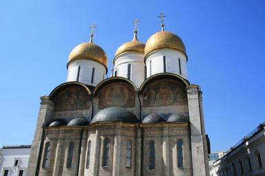Keywords: church russian archetecture russian orthodox buildings sky religion outside golden domes curved facade domed roofs symetric design tall building church square kremlin inauguration cathedral for tsars