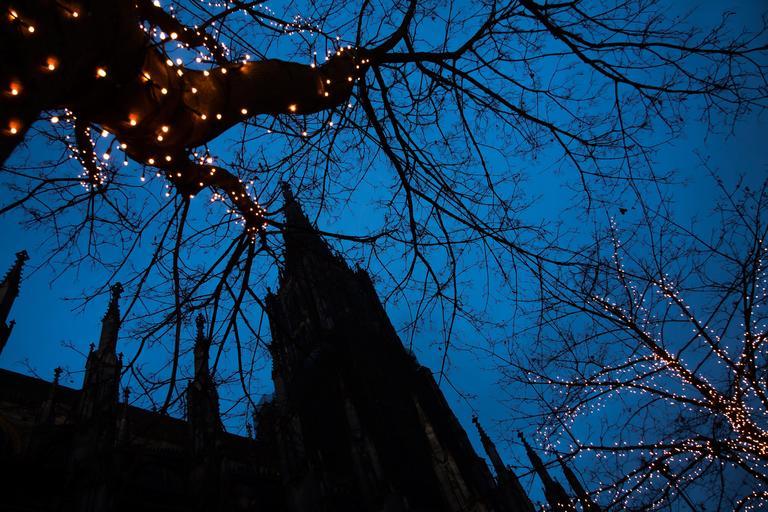 Keywords: church trees lichterkette sky building steeple blue ulm