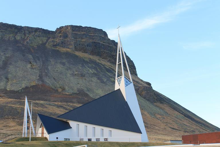 Keywords: church unusual mountain solid filigree geometric triangle construction architecture contrast rock stone grey white protection sky landscape panorama
