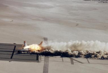 | Keywords: CID Aircraft post-impact lakebed skid DVIDS694569.jpg en Moments after hitting and sliding through the wing openers the aircraft burst into flame with a spectacular fireball seen emanating from the right inboard engine area In a typical aircraft crash fuel spilled from ruptured fuel tanks forms a fine mist that can be ignited by a number of sources at the crash site In 1984 the NASA Dryden Flight Research Facility after 1994 a full-fledged Center again and the Federal Aviation Administration FAA teamed-up in a unique flight experiment called the Controlled Impact Demonstration CID to test crash a Boeing 720 aircraft using standard fuel with an additive designed to supress fire The additive FM-9 a high-molecular-weight long-chain polymer when blended with Jet-A fuel had demonstrated the capability to inhibit ignition and flame propagation of the released fuel in simulated crash tests This anti-misting kerosene AMK cannot be introduced directly into a gas turbine engine due to several possible problems such as clogging of filters The AMK must be restored to almost Jet-A before being introduced into the engine for burning This restoration is called degradation and was accomplished on the B-720 using a device called a degrader Each of the four Pratt Whitney JT3C-7 engines had a degrader built and installed by General Electric GE to break down and return the AMK to near Jet-A quality In addition to the AMK research the NASA Langley Research Center was involved in a structural loads measurement experiment which included having instrumented dummies filling the seats in the passenger compartment Before the final flight on December 1 1984 more than four years of effort passed trying to set-up final impact conditions considered survivable by the FAA During those years while 14 flights with crews were flown the following major efforts were underway NASA Dryden developed the remote piloting techniques necessary for the B-720 to fly as a drone aircraft; General Electric installed and tested four degraders one on each engine ; and the FAA refined AMK blending testing and fueling a full-size aircraft The 15 flights had 15 takeoffs 14 landings and a larger number of approaches to about 150 feet above the prepared crash site under remote control These flight were used to introduce AMK one step at a time into some of the fuel tanks and engines while monitoring the performance of the engines On the final flight No 15 with no crew all fuel tanks were filled with a total of 76 000 pounds of AMK and the remotely-piloted aircraft landed on Rogers Dry Lakebed in an area prepared with posts to test the effectiveness of the AMK in a controlled impact The CID which some wags called the Crash in the Desert was spectacular with a large fireball enveloping and burning the B-720 aircraft From the standpoint of AMK the test was a major set-back but for NASA Langley the data collected on crashworthiness was deemed successful and just as important NASA Identifier NIX-EC84-31806 2009-09-23 Glenn Research Center https //www dvidshub net/image/694569 appears corrupt Alternate source http //www nasa gov/centers/armstrong/multimedia/imagegallery/CID/index html id 358956 694569 2012-10-10 13 19 WASHINGTON DC US PD-USGov Controlled Impact Demonstration Images from DoD uploaded by Fæ |