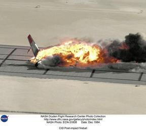 Keywords: CID Post-impact fireball DVIDS713785.jpg en The B-720 after impact and sliding through the wing openers is becoming enveloped in a fireball The right wing appears to be folding over as the aircraft continues to slide In a typical aircraft crash fuel spilled from ruptured fuel tanks forms a fine mist that can be ignited by a number of sources at the crash site In 1984 the NASA Dryden Flight Research Facility after 1994 a full-fledged Center again and the Federal Aviation Administration FAA teamed-up in a unique flight experiment called the Controlled Impact Demonstration CID to test crash a Boeing 720 aircraft using standard fuel with an additive designed to supress fire The additive FM-9 a high-molecular-weight long-chain polymer when blended with Jet-A fuel had demonstrated the capability to inhibit ignition and flame propagation of the released fuel in simulated crash tests This anti-misting kerosene AMK cannot be introduced directly into a gas turbine engine due to several possible problems such as clogging of filters The AMK must be restored to almost Jet-A before being introduced into the engine for burning This restoration is called degradation and was accomplished on the B-720 using a device called a degrader Each of the four Pratt Whitney JT3C-7 engines had a degrader built and installed by General Electric GE to break down and return the AMK to near Jet-A quality In addition to the AMK research the NASA Langley Research Center was involved in a structural loads measurement experiment which included having instrumented dummies filling the seats in the passenger compartment Before the final flight on December 1 1984 more than four years of effort passed trying to set-up final impact conditions considered survivable by the FAA During those years while 14 flights with crews were flown the following major efforts were underway NASA Dryden developed the remote piloting techniques necessary for the B-720 to fly as a drone aircraft; General Electric installed and tested four degraders one on each engine ; and the FAA refined AMK blending testing and fueling a full-size aircraft The 15 flights had 15 takeoffs 14 landings and a larger number of approaches to about 150 feet above the prepared crash site under remote control These flight were used to introduce AMK one step at a time into some of the fuel tanks and engines while monitoring the performance of the engines On the final flight No 15 with no crew all fuel tanks were filled with a total of 76 000 pounds of AMK and the remotely-piloted aircraft landed on Rogers Dry Lakebed in an area prepared with posts to test the effectiveness of the AMK in a controlled impact The CID which some wags called the Crash in the Desert was spectacular with a large fireball enveloping and burning the B-720 aircraft From the standpoint of AMK the test was a major set-back but for NASA Langley the data collected on crashworthiness was deemed successful and just as important NASA Identifier NIX-ECN-31808 2009-09-23 Glenn Research Center https //www dvidshub net/image/713785 713785 2012-10-10 17 31 WASHINGTON DC US PD-USGov Images from DoD uploaded by Fæ Controlled Impact Demonstration