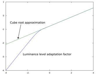 | Keywords: Ciecam02 luminance level adaptation factor.svg CIECAM02 log-log plot of luminance level adaptation factor and its cube root approximation versus the luminance level of the adapting field The axes indicate the base 10 logarithm of the quantity so L<sub>A</sub> ranges from 10<sup>-4</sup> to 10<sup>4</sup> while F<sub>L</sub> ranges from 10<sup>-4</sup> to 10 MATLAB 2008-02-12 Myself MATLAB Code <pre> la logspace -4 4 k 1 / 5 la+1 fl k 4 la+0 1 1-k 4 2 5 la 1/3 loglog la fl la 0 1715 la 1/3 set gca 'XTickLabel' -4 2 4 'YTickLabel' -4 1 </pre> If you are curious as to how I derived the 0 1715 coefficient you need simply substitute la 1 to get k 1/6 and fl 0 1715 CIECAM02 |