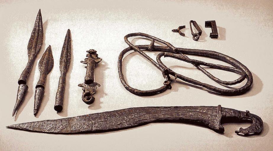 Keywords: Cigarralejo003.jpg es Panóplia ibérica de El Cigarralejo soliferrum falcata lanzas y asas de escudo Foto propia Extrema dorii 2011-08-23 Foto propia Cc-zero Museo de Arte Ibérico El Cigarralejo Panoplia