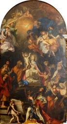 | Keywords: Cignani Heilige Sippe.png Artwork Creator Carlo Cignani The Holy Kinship on the left Joachim Joseph and Anne in the center Mary with the Infant Jesus on the right John the Baptist as a boy his parents Elizabeth and Zechariah in the foreground king David playing the harp together with angels also playing musical instruments at the top a dove symbolizing the Holy Spirit and God the Father in a blue cloak links Joachim Josef und Anna im Zentrum Maria mit dem Jesusknaben rechts Johannes der Täufer als Knabe seine Eltern Elisabet und Zacharias im Vordergrund König David Harfe spielend mit musizierenden Engeln oben Taube als Symbol des Heiligen Geists und Gottvater im blauen Mantel 1676 Oil on canvas Size cm 440 850 Munich Theatine Church northern transept Theatinerkirche nördliches Querschiff PD-old-100 Self-photographed /Der Harmlos Interior of Theatinerkirche Munich Carlo Cignani Holy Kinship Baroque paintings in Upper Bavaria 1676 paintings |