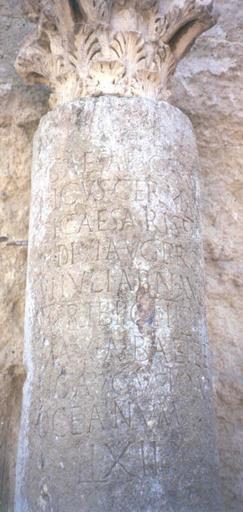 Keywords: CILII6208.JPG es Miliario de Calígula depositado en la Mézquita de Córdoba procedente de Córdoba correspondiente con CIL II 6208 CIL II<sup>7</sup> 2 cuyo texto dice C aius Caesar Germa/nicus Germani/ci Caesaris f ilius Ti beri Aug usti / n epos divi Aug usti pron epos divi/ Iuli abn epos Aug ustus p ater p atriae co n s ul II/ imp erator trib unicia pot estate II pont ifex / max imus a Baete et Ia/no Augusto ad/ Oceanum/ LXII es Hispania Epigraphica http //eda-bea es/pub/record_card_1 php refpage 2Fpub 2Fsearch_select php quicksearch +CIL+II+6208 rec 1881 1881 fr Borne miliaire de Caligula déposée dans la Mosquée-Cathédrale de Cordoue et qui correspond au CIL II 6208 CIL II<sup>7</sup> 2 cuyo texto dice C aius Caesar Germa/nicus Germani/ci Caesaris f ilius Ti beri Aug usti / n epos divi Aug usti pron epos divi/ Iuli abn epos Aug ustus p ater p atriae co n s ul II/ imp erator trib unicia pot estate II pont ifex / max imus a Baete et Ia/no Augusto ad/ Oceanum/ LXII own Caligatus 10-08-2003 CIL II 006208 Ancient Roman inscriptions in Andalusia Baetica Miliaria in Spain Caligula Spolia in Spain Corduba Roman milestones in the Mosque-Cathedral of Córdoba Linked to HEp |