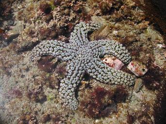 | Keywords: nps cinms sea star seastar starfish knobby symmetry crunch biology water underwater animal coral In Channel Islands National Marine Sanctuary lies a knobby sea star. The knobs on this sea star are actually jaw-like structures that crunch on small organisms that land on them! Photo Credit: NPS In Channel Islands National Marine Sanctuary lies a knobby sea star. The knobs on this sea star are actually jaw-like structures that crunch on small organisms that land on them! Photo Credit: NPS |