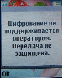| Keywords: Ciphering NotProvidedRu.JPG en The message in Russian on the screen of a mobile phone with the warning about lack of ciphering ru П едуп еждение на эк ане сотового телефона об отсутствии шиф ования на сети Own Ds02006 2009-04-13 GSM Standard Security |