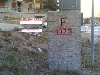 | Keywords: Cippo di confine - Claviere - Parte francese.jpg Italiano Foto del cippo confine n° 24 tra Italia e Francia 1975 vicino a Claviere I Questo è il lato francese Questo cippo venne posato a seguito della creazione dei nuovi confini tra l'Italia e la Francia 1974 <br> Français Photo de la borne frontière n°24 entre l'Italie et la France 1975 à coté du village de Clavière I Cette-ci est la partie française Cette borne fut posée après la création des nouvelles frontières entre Italie et France 1974 <br> English Photo of the border milestone n°24 between Italy and France 1975 close to the village of Claviere I coté du village de Clavière I This is the french side This milestone was put after the creation of the new borders between Italy and France 1974 Own 2007-11-08 Cribegh GFDL Claviere Boundary stones in Italy Boundary stones in Hautes-Alpes |