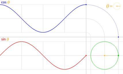 | Keywords: Circle cos sin.gif en We have the unit circle with radius 1 in green placed at the origin at the bottom right In the middle of this circle in yellow is represented the angle theta θ This angle is the amount of counter-clockwise rotation around the circle starting from the right on the x-axis as illustrated An exact copy of this little angle is shown at the top right as a visual illustration of the definition of θ At this angle and starting at the origin a faint green line is traced outwards radially This line intersects the unit circle at a single point which is the green point spinning around at a constant rate as the angle θ changes also at a constant rate The vertical position of this point is projected straight along the faint red line onto the graph on the left of the circle This results in the red point The y-coordinate of this red point the same as the y-coordinate of the green point is the value of the sine function evaluated at the angle θ that is y coordinate of green point sin θ As the angle θ changes the red point moves up and down tracing the red graph This is the graph for the sine function The faint vertical lines seen passing to the left are marking every quadrant along the circle that is at every angle of 90° or Ï /2 radians Notice how the sine curve goes from 1 to zero to -1 then back to zero at exactly these lines This is reflecting the fact sin 0 0 sin Ï /2 1 sin Ï 0 and sin 3Ï / 2 -1 A similar process is done with the x-coordinate of the green point However since the x-coordinate is tilted from the usual convention to plot graphs where y f x with y vertical and x horizontal an untilt operation was performed in order to repeat the process again in the same orientation instead of vertically This was represented by a bend seen on the top right Again the green point is projected upwards along the faint blue line and this bent projection ends up in the top graph ™s rightmost edge at the blue point The y-coordinate of this blue point which due to the bend in the projection is the same as the x-coordinate of the green point is the value of the cosine function evaluated at the angle θ that is x coordinate of green point cos θ The blue curve traced by this point as it moves up and down with changing θ is the the graph of the cosine function Notice again how it behaves at it crosses every quadrant reflecting the fact cos 0 1 cos Ï /2 0 cos Ï -1 and cos 3Ï /2 0 own LucasVB 2014-03-16 Trigonometry Trigonometric functions Sine function Cosine function Mathematical animations |