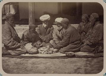 | Keywords: Circumcision central Asia.jpg Customs of Central Asians Circumcision Photograph shows a group of men seated on the ground near a small boy who is being circumcised Albumen print Illus in Turkestanskīi al'bom chast' ėtnograficheskaia 1871-1872 part 2 vol 1 pl 71 Batga sic buri translated from Persian as circumcision Library of Congresshttp //hdl loc gov/loc pnp/ppmsca 12206 between 1865 1872 Author Unrestored version of File Circumcision central Asia1 tif partial restoration also File Circumcision central Asia2 tif and File Circumcision central Asia2 jpg full restoration uncompressed and compressed PD-old Circumcision Black and white photographs of sitting men History of Central Asia Albumen prints |