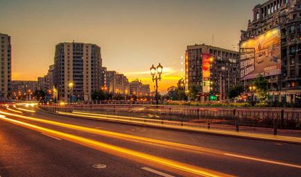 Keywords: city buildings road street cars lights sunset dusk lamp posts railing billboards signs