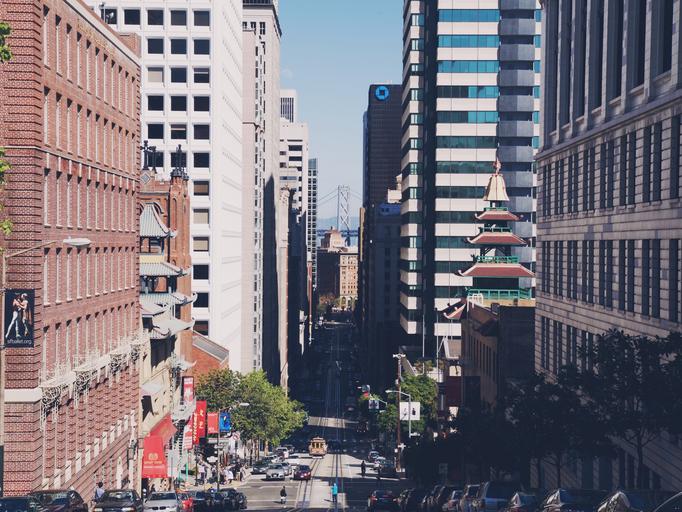 Keywords: city downtown urban view street road san francisco usa america famous cable car cityscape buildings facades architecture skyscraper bridge pillar