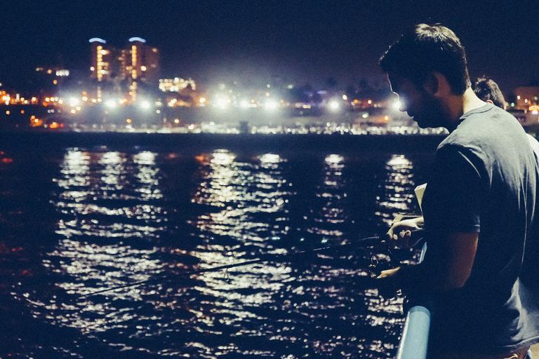 Keywords: city people urban ocean bay sea relax fishing leisure lifestyle outdoors young persons rod water dark night pier tshirt man lights evening