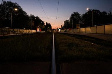 Keywords: city rails train tracks evening grass public transport wires bus stop