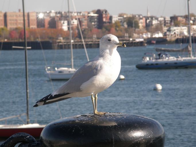 Keywords: city stump sitting harbor buoys stop yachts bird water post river seagull