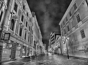 Keywords: city urban night evening black and white hdr sky clouds street lights lighting sidewalk buildings architecture outside beautiful