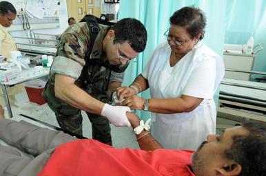 | Keywords: Civic assistance mission at Couva District Health Facility DVIDS126486.jpg en Lt Hector Acevedo a physician embarked aboard the amphibious assault ship USS Kearsarge works with a Trinidadian nurse to give a patient an intravenous line at a local health facility during the humanitarian/civic assistance mission Continuing Promise 2008 Kearsarge is the primary platform for the Caribbean phase of CP an equal-partnership mission involving the United States Canada the Netherlands Brazil Nicaragua Colombia Dominican Republic Trinidad and Tobago and Guyana 2008-10-28 Petty Officer 2nd Class William Parker https //www dvidshub net/image/126486 081028-N-+++++-183 2008-11-05 03 56 COUVA TT PD-USGov-Military-Navy USS Kearsarge LHD-3 Images from DoD uploaded by Fæ |