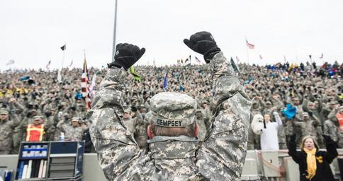 | Keywords: CJCS attends Army vs. Air Force football game 141101-D-KC128-247.jpg en Chairman of the Joint Chiefs of Staff Gen Martin E Dempsey leads U S Military Academy Cadets in the rocket cheer during an Army vs Air Force football game at Michie Stadium West Point N Y Nov 1 2014 Air Force beat Army 23-6 winning the Commander-in-Chief's Trophy for the 19th time DOD photo by Mass Communication Specialist 1st Class Daniel Hinton/Released 2014-11-01 Petty Officer 1st Class Daniel Hinton https //www dvidshub net/image/1734276 141101-D-KC128-247 2015-01-24 10 05 WEST POINT NY US PD-USGov Martin E Dempsey Images from DoD uploaded by Fæ |