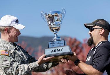 | Keywords: CJCS and VCJCS attend Warrior Games Tailgate and AF vs. Navy football 141004-D-HU462-165.jpg en Chairman of the Joint Chiefs of Staff U S Army Gen Martin E Dempsey presents the Chairman's Cup trophy which is awarded to the top overall performing service branch to Army team captain Frank Barroquiero during the Warrior Games tailgate celebration at the U S Air Force Academy's Falcon Stadium in Colorado Springs Colo Oct 4 2014 This year the Army broke the Marine Corps' four-year winning streak DOD photo by Staff Sgt Sean K Harp U S Army/Released 2014-10-04 Staff Sgt Sean Harp https //www dvidshub net/image/1603407 141004-D-HU462-165 2014-10-07 16 02 UNITED STATES AIR FORCE ACADEMY CO US PD-USGov Martin E Dempsey Falcon Stadium Images from DoD uploaded by Fæ |