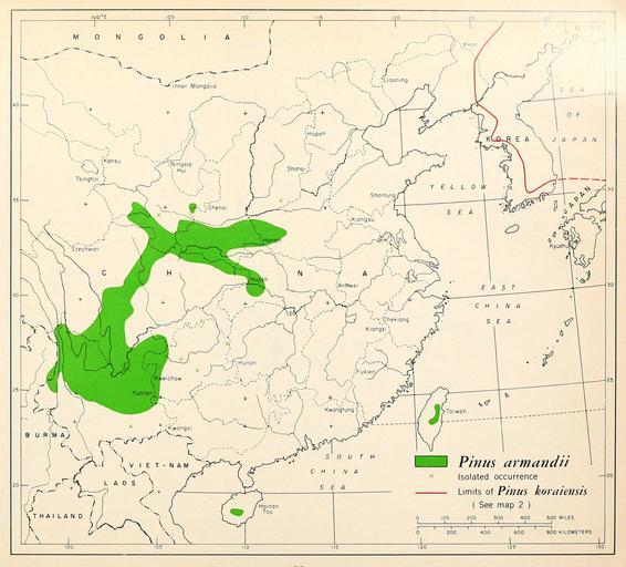 | Keywords: CL-11 Pinus armandii range map.png en Map 11 Pinus armandii distribution 1966-02 http //www biodiversitylibrary org/bibliography/66393 /summary Geographic distribution of the pines of the world Miscellaneous publication no 991 U S Department of Agriculture Forest Service Washington D C February 1966 William B Critchfield Elbert L Little Jr U S Department of Agriculture Forest Service PD-USGov Geographic Distribution of the Pines of the World Uploaded with UploadWizard Pinus armandii | ||||