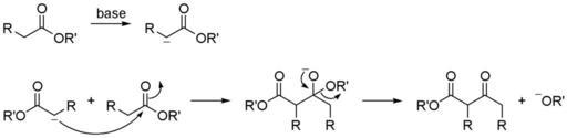 Keywords: Claisen condensation.png Reaction scheme of Claisen condensation Made with ChemDraw Claisen condensation 2006-02-18 own assumed Calvero