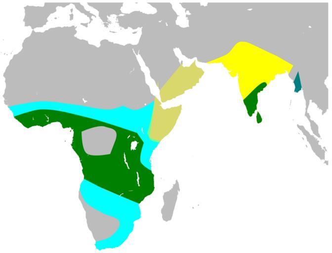 Keywords: ClamatorJacobinusMap.svg en Distribution range summer - yellow pale - in passage dark green - resident of Clamator jacobinus Own L Shyamal 2009 Clamator jacobinus Cuculiformes distribution maps
