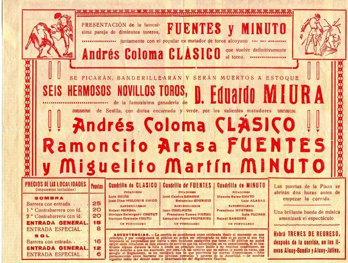 Keywords: Clásico últim cartell.jpg en Poster of the last appearance as a bullfighter of Andrés Coloma Sanjuán Clásico matador from Alcoi Alcoi 16th April 1944 ca Cartell de l'última aparició de Clásico vestint el trage de llums Alcoi 16 d'abril de 1944 own - digitalització d'un cartell públic propietat de l'autor Original i il·lustracions anònimes OvidiCarbonell 16 d'abril de 1944 Check categories 2009 October 29 ca wikipedia Andrés_Coloma Alcoi 3 Alcoi Bullfighting posters People of the Land of Valencia 1944 in Spain 1944-04-16 |