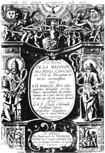 | Keywords: Claude d'Abbeville, Histoire de la mission, frontispicio.png Frontispício da obra Histoire de la mission Paris 1614 O frontispício é típico para a época uma arquitectura simbólica com uma alegoria da Gallia ecclesiae primogenita a França a primeira filha da Igreja a igreja católica francesa no alto Ela é apresentada como Nossa Senhora que abre o seu casaco um tipo da arte medieval em alemão Schutzmantelmadonna Há duas estátuas ao lado São Francisco e São Pedro ambas com selvagens que rezam Em relevos são mostrados selvagens que comem pedaços humanos moqueados motivo que já conhecemos da tradição No relevo à direita há um Capuchinho com um índio sendo batizado No alto uma inscrição simbólica Indis Sol splendet splendescunt Lilia Gallis O sol das Indias brilha os lírios francesas brilham e dois escudos de armas os lírios da França e o Sol como símbolo do Maranhão francês http //scielo iec pa gov br/scielo php script sci_arttext pid S1807-53982005000100009 lng pt nrm iso tlng pt 1614 Claude d'Abbeville PD-old-100 Claude d'Abbeville Our_Lady_of_Mercy |
