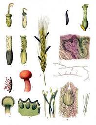 Keywords: Claviceps purpurea - Köhler–s Medizinal-Pflanzen-185.jpg Mutterkornpilz A Roggenähre mit Sclerotien natürl Grösse; 1 reifes Sclerotium desgl ; 2 Fruchtknoten mit dem Pilzmycelium bedeckt vergrössert; 3 derselben im Längsschnitt desgl ; 4 Fruchtknoten mit dem Anfang der Bildung des clerotiums desgl ; 5 dieselbe Figur im weiteren Entwicklungsstadium desgl ; 6 Letztere Figur im Längsschnitt desgl ; 7 Mycelium mit Conidienträgern und Conidien desgl ; 8 Sclerotium mit den Fruchtträgern desgl ; 9 Fruchtträger stärker vergrössert; 10 derselbe im Längsschnitt mit den Perithecien desgl ; 11 Schnitt aus der Perithecienschicht noch stärker vergrössert; 12 Einzelnes Perithecium noch stärker vergrössert; 13 Sporenschläuche desgl dieselben müssen am oberen Ende etwas verjüngt sein ; 14 Schlauchsporen desgl ; 15 Keimende Schlauchsporen Claviceps purpurea Спо ынья пу пу ная A колос жи со скле оциями; 1 скле оций; 2 завязь цветка за аженного астения с мицелием г иба; 3 то же в п одольном аз езе; 4 завязь в начале фо ми ования скле оциев; 5 то же в дальнейшем азвитии; 6 ис 5 в п одольном аз езе; 7 мицелий с конидиеносцами и конидиями; 8 скле оций п о осший ст омами; 9 ст ома; 10 то же в п одольном аз езе с пе итециями; 11 аз ез головки ст омы видны пе итеции; 12 отдельный пе итеций с сумками; 13 сумки с аскоспо ами; 14 аскоспо ы; 15 п о осшие аскоспо ы 1897 http //pharm1 pharmazie uni-greifswald de/allgemei/koehler/koeh-eng htm List of Koehler Images Franz Eugen Köhler Köhler's Medizinal-Pflanzen PD-old Köhler's Medizinal-Pflanzen Claviceps purpurea |