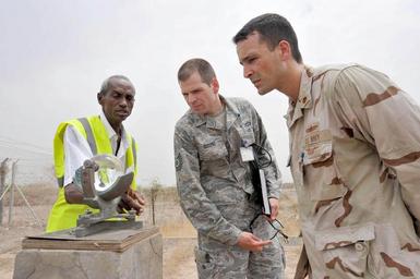 | Keywords: Clear Skies Forecasted, CJTF-HOA Meteorologists Share Technology With Djibouti DVIDS202529.jpg en Mr Said Darar chief of climatologic data for Djibouti shows U S Air Force Tech Sgt David Giddens and U S Navy Lt Cmdr Ricardo Trevino a heliograph an instrument used to measure sunshine duration at the Ambouli International Airport in Djibouti Sept 5 Giddens a member of the Washington Air National Guard and a native of Jacksonville Fla and Trevino head of Combined Joint Task Force-Horn of Africa's Meteorological and Oceanographic Department and a native of Bayamon Puerto Rico were at the airport to install a high-frequency line-of-sight antenna that will allow Djiboutian weather forecasters to receive a steady stream of information from CJTF-HOA's AN/TMQ-53 Tactical Meteorological Observing System <br>Unit Combined Joint Task Force - Horn of Africa 2009-09-05 Petty Officer 1st Class Jonathan Kulp https //www dvidshub net/image/202529/clear-skies-forecasted-cjtf-hoa-meteorologists-share-technology-with-djibouti 090905-N-+++++-034 2009-09-09 12 55 DJIBOUTI DJ PD-USGov-Military-Navy Combined Joint Task Force - Horn of Africa Images from DoD uploaded by Fæ |