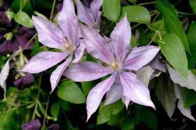 Keywords: clematis flower vine purple violet lavender summer blossom outdoor colorful color plant nature close-up bright open fresh garden pair two