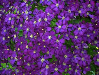 Keywords: clematis flowers violet purple blue green leaves flowering plants ornamental decorative blossoms blooming blooms fleurs gardening gardens flower beds dense growing vines climbing climbers