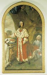 Keywords: Clemensaugust.jpg Artwork Creator George Desmarées de Links im Hintergrund Schloss Falkenlust <br /> Clemens August mit allen Zeichen seiner geistlichen und weltlichen Herrschaft Kurmantel und Kurhut stehen für das Kurfürstentum Köln das auf der Brust hängende bischöfliche Pektorale der Kragen des Priesterornats und die auf dem Tisch hinter dem Kurhut liegende Mitra versinnbildlichen sein Amt als Erzbischof von Köln c 1746 Oil on canvas Schloss Augustusburg Brühl first upload to de wp 09 35 14 Jun 2005 by Leonce49 other versions <gallery>1700 Clemens-August JPG Bundesarchiv B 145 Bild-F024827-0005 Schloß Brühl Staatsempfang für Kaiser von Iran jpg</gallery> PD-old-100 DEFAULTSORT 1746c; Clemens August of Bavaria George Desmarées Interior of Schloss Augustusburg Brühl Clemens August of Bavaria 1740s oil on canvas paintings Portrait 1740s portrait paintings Male 18th-century oil on canvas paintings in Germany 18th-century oil portraits of standing men at full length in ceremonial robes 18th-century portrait paintings in Germany Ermine clothing in art Ermine headgear in art Male shoes in portrait paintings Paintings by George Desmarées with fur Portrait paintings of men with crowns on cushions Portraits with page boy Tables in portrait paintings