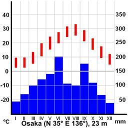 | Keywords: ClimateOsakaJapan.png Climate diagram of Osaka Japan Map based Image ClimateTemplate PNG Source http //www data jma go jp/obd/stats/etrn/view/nml_sfc_ym php prec_no 62 prec_ch 91 E5 8D E3 95 7B block_no 47772 block_ch 91 E5 8D E3 year month day elm normal view JMA data 2007-03-09 own assumed Pekachu Created with Inkscape Climate diagrams of Japan Seasons in Osaka |