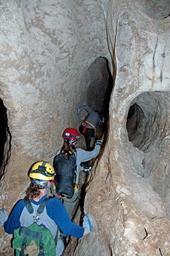 Keywords: Cavers climb up through a slotted passage. (NPS Photo by Dale Pate) nps climbing cave cavers