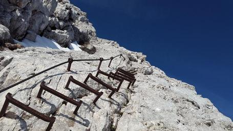 Keywords: climbing alpspitze head ladder rungs kicks gradually away height rise climb north face ferrata rock alpine weather stone mountain zugspitze massif ostallgäu allgäu landscape